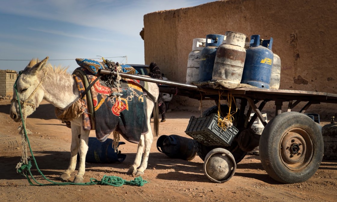An empty gas cylinder weighs about 13 kg. A full one, 23 kg. Their means of transport? Women, who with astonishing agility, roll them along rugged paths by pushing with their feet. Without this incredible choreography, no hot meal would be possible.